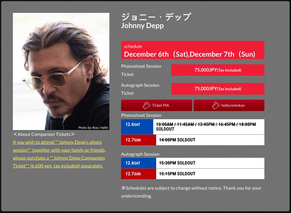 據報道,Tokyo Comic Con當日尊尼特普(Johnny Depp)的合照簽名會延遲5個小時才開始,而持有12月6日指定時段合照券的觀眾,就可選擇改至翌日(07/12)補拍。當日合照簽名,也持續至晚上將近11點才完成部份活動。