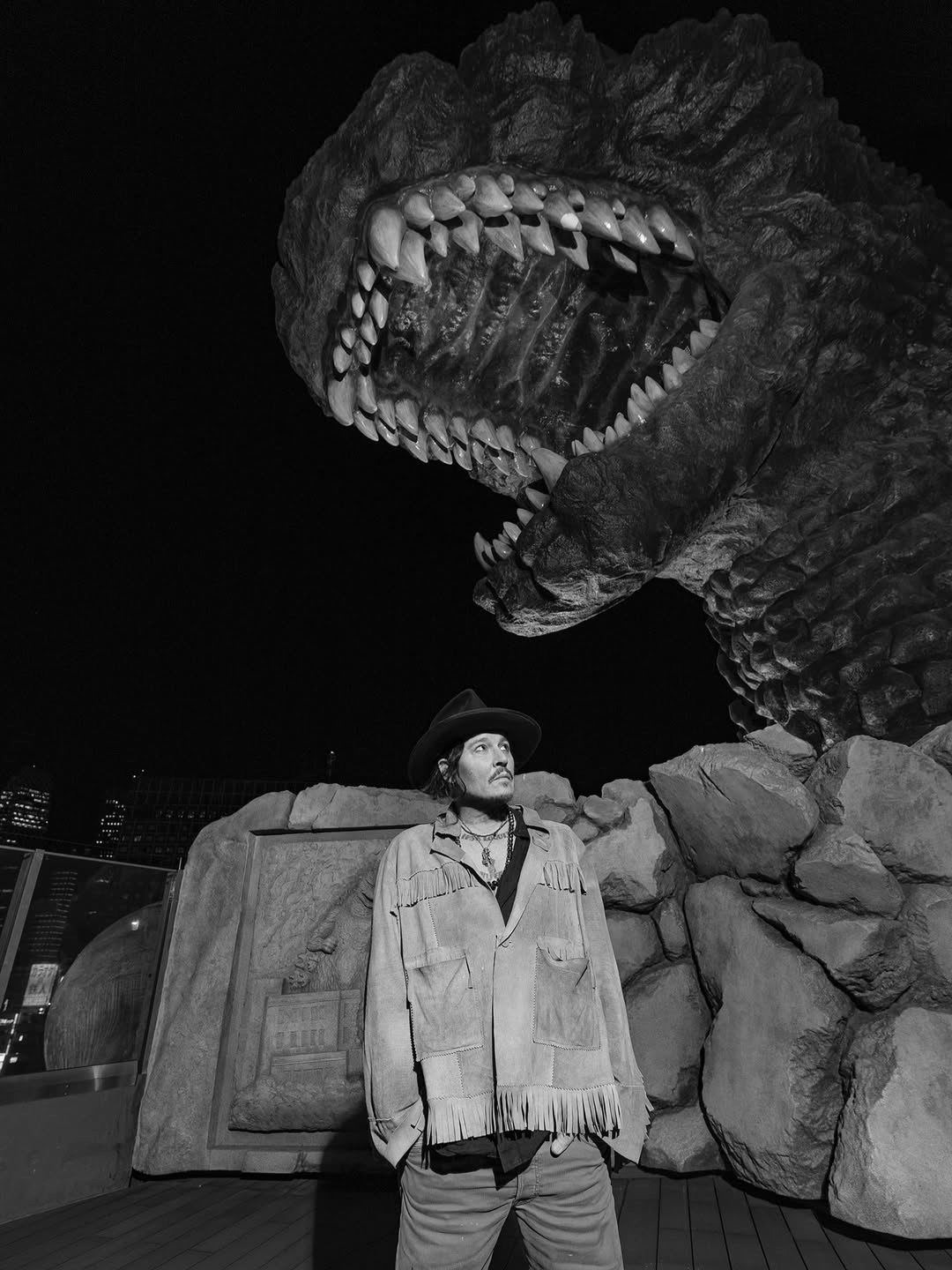 在尊尼特普Johnny Depp的個人Instagram中也可看到,他還在百忙中抽空到格拉斯麗新宿酒店(Hotel Gracery Shinjuku)與著名的哥斯拉雕像拍照,相當之貼地。