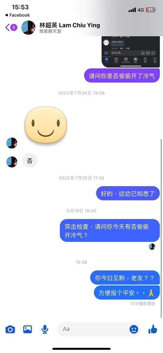 不時有網民貪玩在炎炎夏日的日子私訊他,問他:「請問你有否偷偷開冷氣?」他也會回覆:「否。」(網上圖片)
