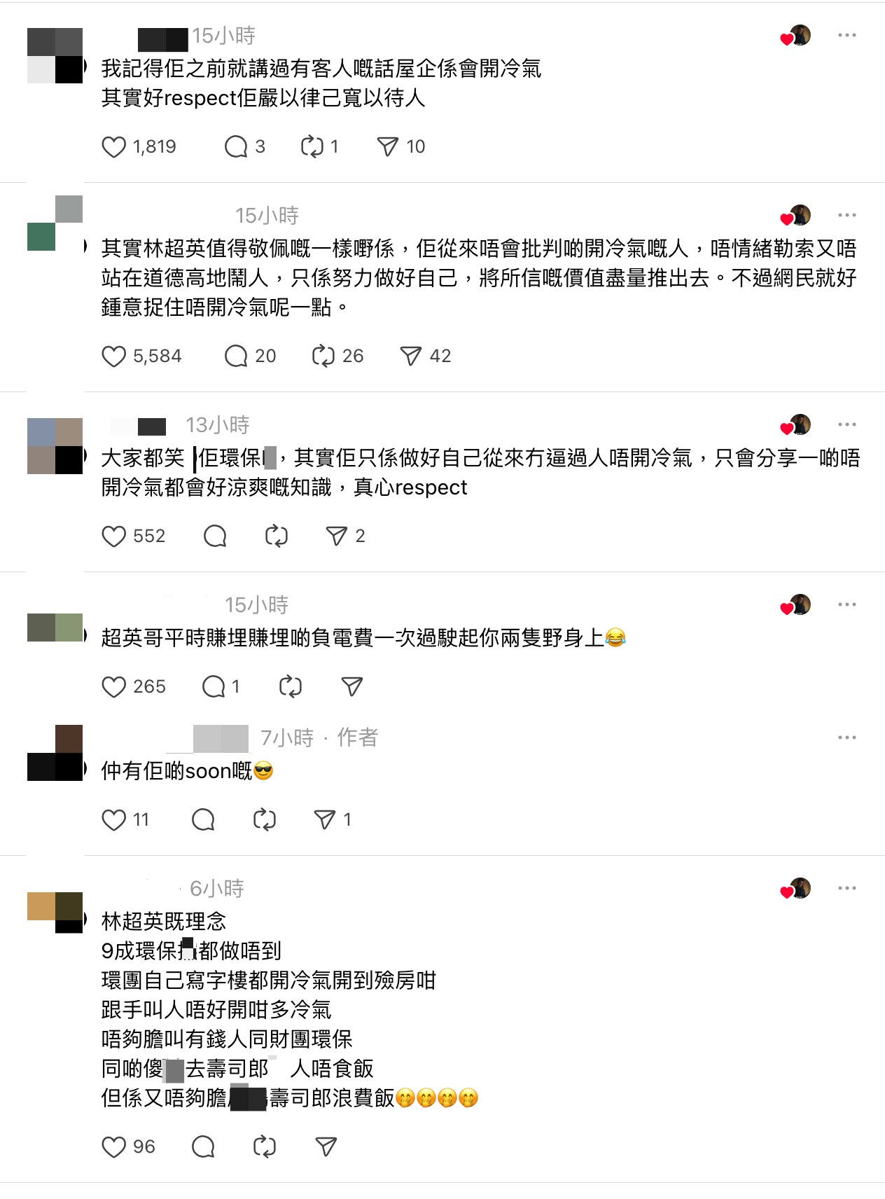 前天文台台長林超英一向以愛護環境聞名,十多年來更堅持不開冷氣,形容開冷氣有如「飲鴆止渴」,暑假時電費竟然是負7元,贏了99%香港人!不時有網民貪玩在炎炎夏日的日子私訊他,問他:「請問你有否偷偷開冷氣?」他也會回覆:「否。」又或是天氣高溫到37、38度的日子,網民都會私訊他,叫他報平安,擔心超英哥中暑倒下。