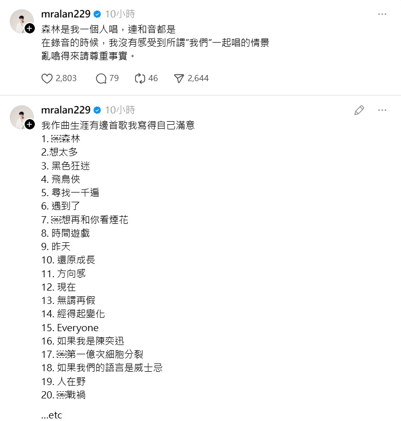 樂隊Mr.前主唱布志綸(Alan Po)在12月31日凌晨突然在Threads連環發帖,言詞極其激進,直指多年來隱藏的樂隊內幕。Alan首先列出20首自己滿意的作曲作品,隨即話鋒一轉,火燒樂隊代表作《森林》。他憤怒表示:「《森林》是我一個人唱,連和音都是,在錄音的時候,我沒有感受到所謂『我們一起唱』的情景。」他更警告相關人士不要再亂傳,「請尊重事實」,此言一出,立即引發網民熱議,質疑多年來塑造的「樂隊團結」形象只是幻象。