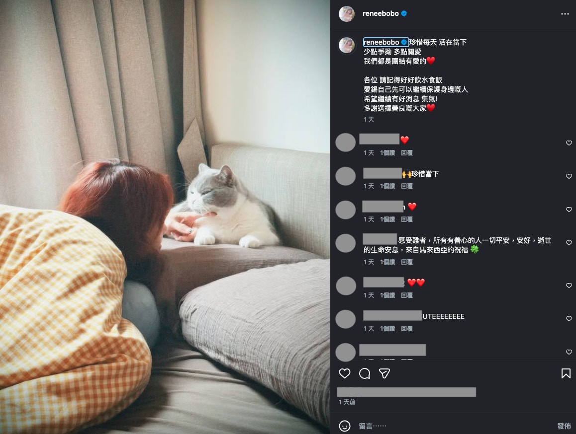 所幸最終只是虛驚一場。「原來真係會好慌,啱啱沖完涼個頭仲濕緊,原來係乜都唔會多諗,只係諗住帶Nigo同出街果(嗰)個袋……」翌日,她也有感而發,嘆要珍惜當下。「珍惜每天,活在當下,少點爭拗,多點關愛我們都是團結有愛的。各位,請記得好好飲水食飯,愛錫自己先可以繼續保護身邊嘅人,希望繼續有好消息,集氣!多謝選擇善良嘅大家。」。