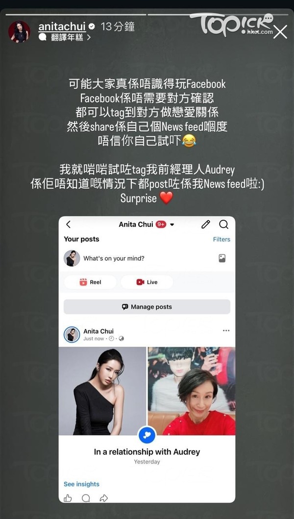 崔碧珈回應戀情︱崔碧珈更改Facebook感情狀況 解釋社交平台玩法
