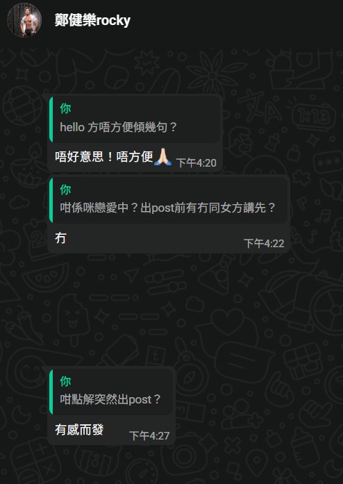 《香港01》昨日(16日)聯絡上鄭健樂,他拒絕直接用電話通話,只願意短訊回覆。鄭健樂十分合作,幾乎是有問必答。問到他與崔碧珈的最新感情狀況,他的答法跟女方一致:「我哋係好好好好朋友」。他表示在Facebook更新status,tag了崔碧珈表示「戀愛中」,事前沒有先通知女方,但為何突然出Post?他解釋:「有感而發」。他直認自己思想單純,覺得崔碧珈是「好女仔」,問到是否仍渴望追求愛情?他說:「隨緣。」
