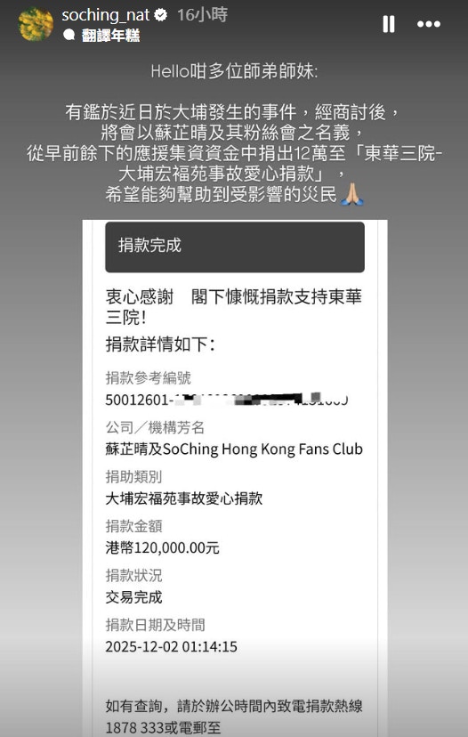 So Ching將會以蘇芷晴及其粉絲會之名義,從早前餘下的應援集資資金中捐出12萬至「東華三院-大埔宏福苑事故愛心捐款」。(IG@soching_nat)