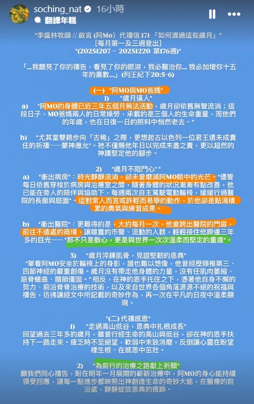 代禱信中,還透露阿Mo雖曾經歷頸椎第三、四節神經的嚴重創傷,但沒有任肌肉萎縮、筋骨蜷曲、關節僵固情況出現。而明年一月更將展開新治療,祈盼「阿Mo的身心能持續領受回應,讓每一點進步都映照出神創造生命的奇妙大能,在醫療的前沿處靜靜綻放恩典的痕跡」。