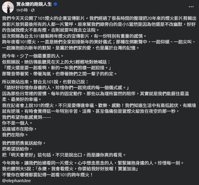 賈永婕隨後更是在Facebook發文稱,這次熙娣為台北101錄製跨年煙火的宣傳影片,有一份特別有重量的感情。跨年夜看煙火,一直是小S一家迎接新年的重要儀式,今年卻少了一個最重要的人,不過小S說她彷彿能聽見在天上的大S輕聲對她說:「煙火還是要一起看啊,新的一年我們照樣一起迎接」。