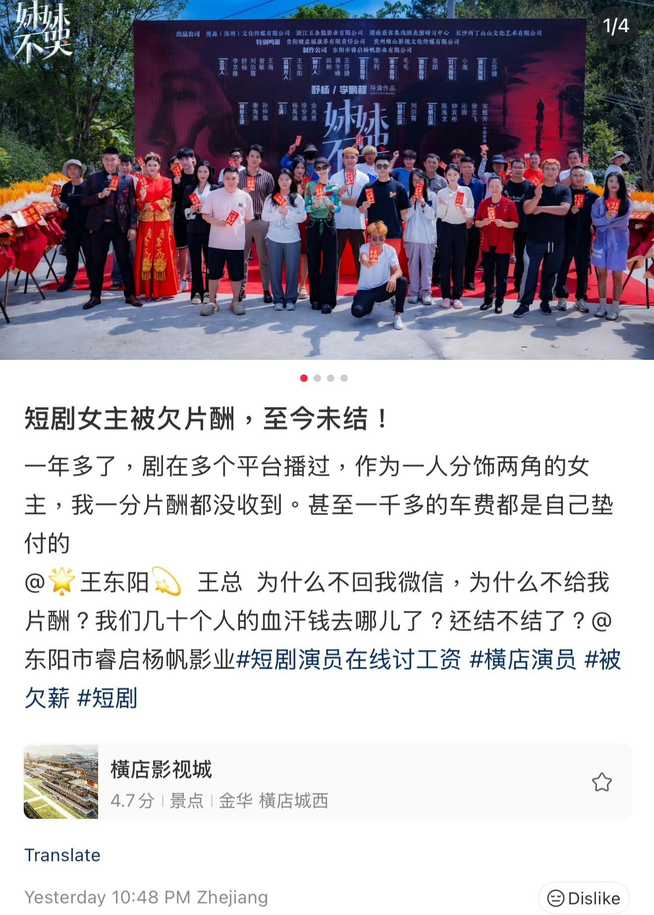 近日短劇女主角謝海燕在社交平台發文爆料,稱完成拍攝工作後「一分片酬都沒收到,甚至一千多的車費都是自己墊付的」。從謝海燕分享的照片中,劇集名從《妹妹不哭》改為《妹妹別哭向陽而生》,而宋懿芳則是友情演出,在播放平台上亦可見宋懿芳的名字。網上流出多人留言追討欠薪的圖片。