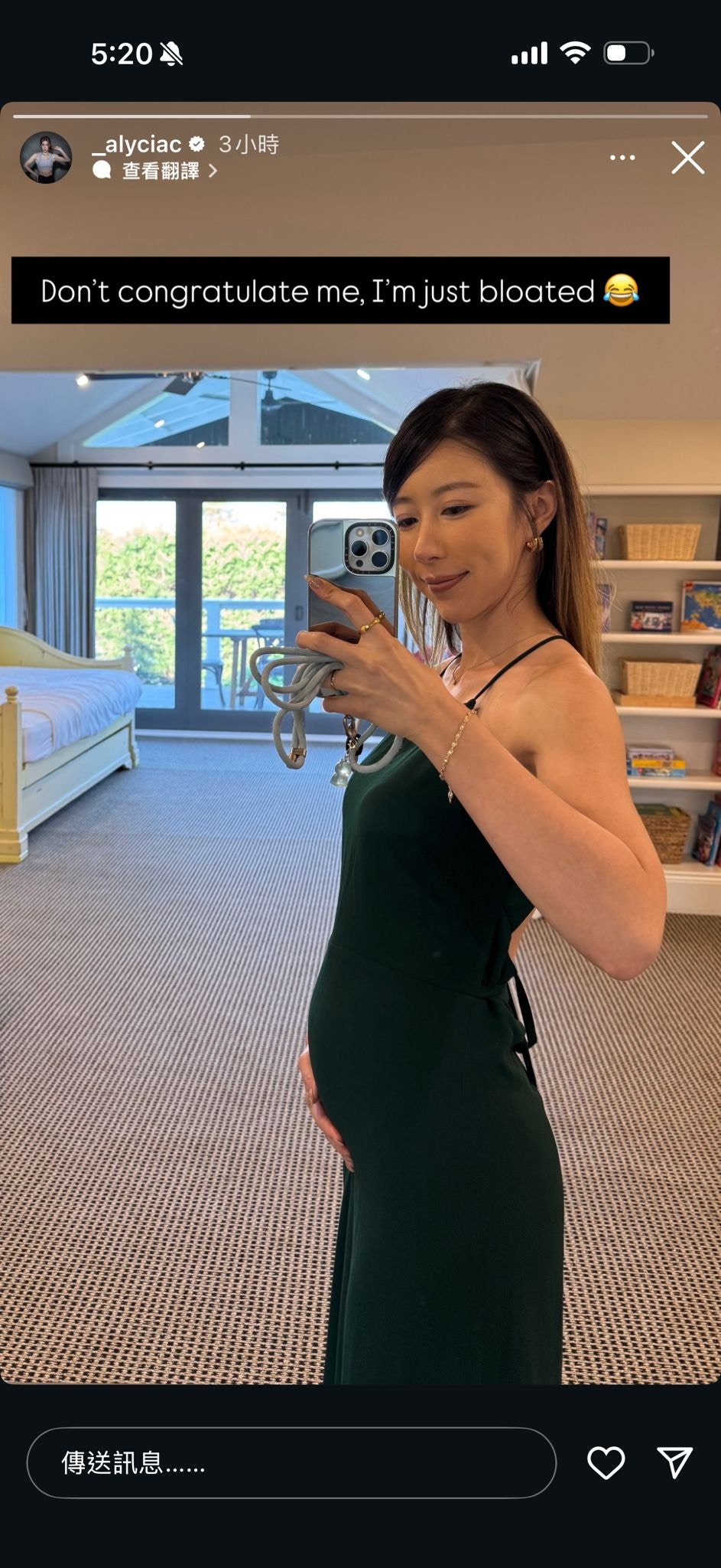 不過,Alycia火速澄清,原來只是「一場誤會」。她直言,其隆起的腹部並非有喜,只是「脹氣」所致。她更搞笑地叫大家不用恭喜她,間接否認了懷孕傳聞。