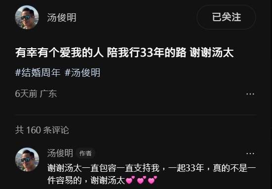 日前湯俊明在社交平台罕有曬婚照放閃,由二人年輕時的青澀舊照,到近年出皺紋一齊變老,湯俊明在影片中寫道:「謝謝湯太陪伴我33年,結婚26周年」。他更情深留言:「有幸有個愛我的人,陪我行33年的路,謝謝湯太 #結婚周年」,並由衷感激太太:「謝謝湯太一直包容一直支持我,一起33年,真的不是一件容易的,謝謝湯太💕💕💕。」獲不少網民送上真摯的祝福。