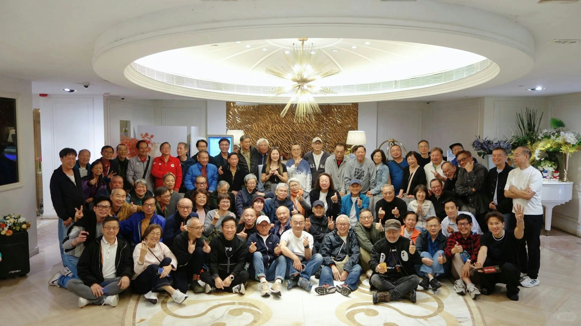 席間周潤發表現親民,完全沒有巨星架子。他除了與舊同事逐一合照外,更親自拿起手機擔當「攝影師」與眾人自拍。在大合照環節,由於人數近百,周潤發更直接與眾人一同坐在地上,笑逐顏開並開心舉「雙V」,與昔日戰友打成一片。