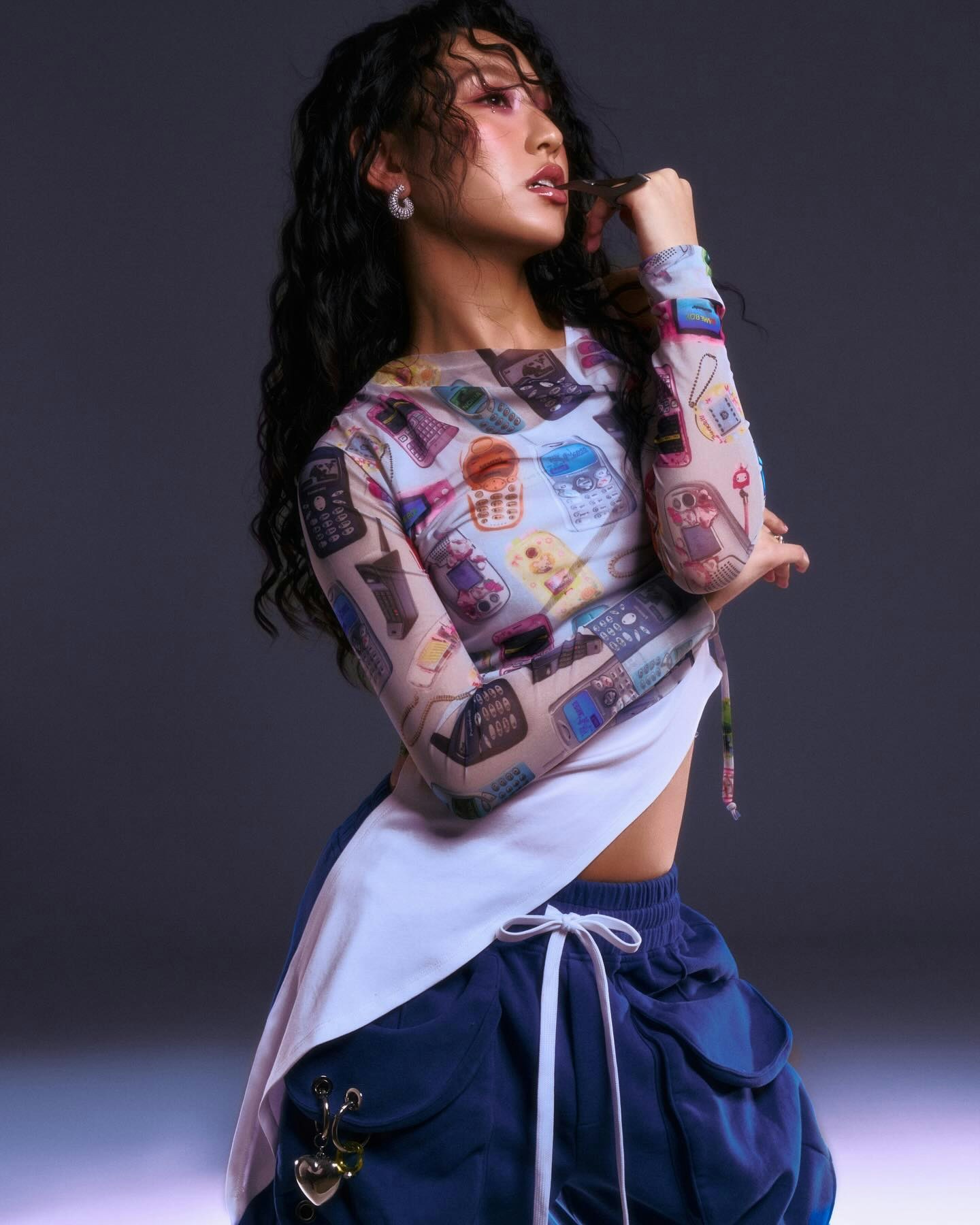 Gigi在社交平台發布了一輯新相,首以一身Y2K打扮拍硬照,除了一頭鬈髮外,她穿上一件印滿Nokia、Siemens等千禧年代復古手機圖案的半透視Mesh Top,上衣的剪裁緊身,讓她輕露小蠻腰,復古之餘帶點叛逆感。(IG@yiminghay)