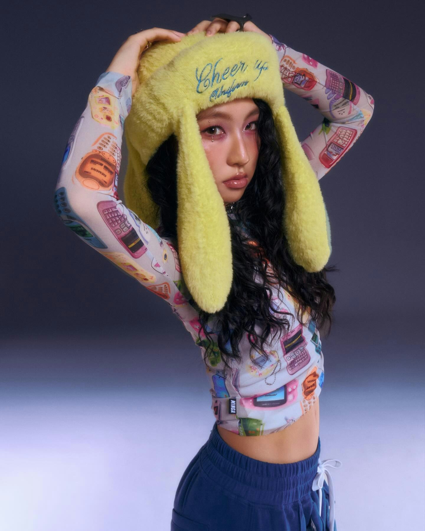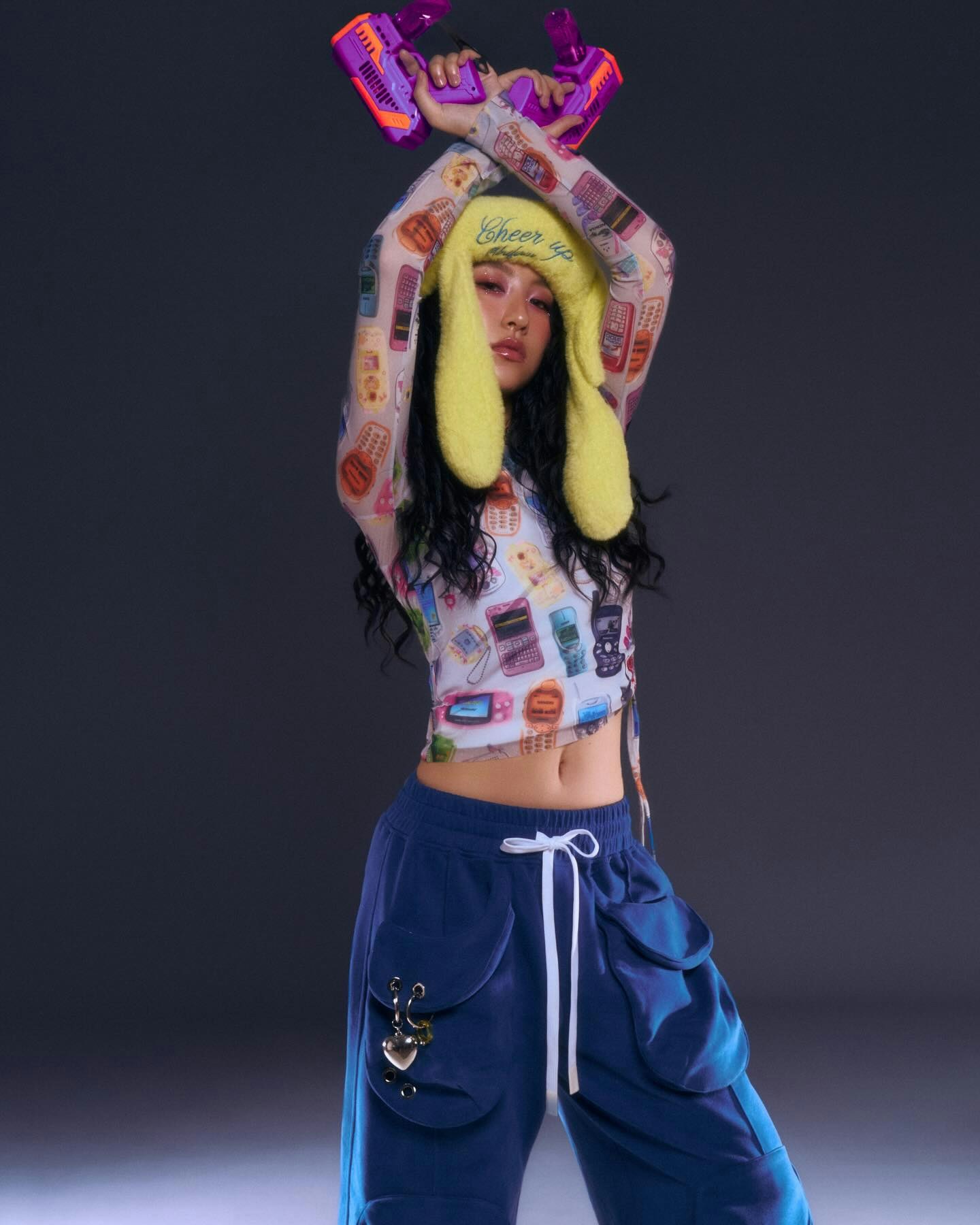 近日Gigi在社交平台發布了一輯新相,首以一身Y2K打扮拍硬照,除了一頭鬈髮外,她穿上一件印滿Nokia、Siemens等千禧年代復古手機圖案的半透視Mesh Top,相信這些手機她可能都未必見過,這件上衣的剪裁緊身,讓她輕露小蠻腰,復古之餘帶點叛逆感。為了配合造型,她還戴了一頂巨型螢光黃色毛毛兔耳帽,配上眼角的粉色閃石妝容,充滿韓系女團味道,精靈而不失新鮮感。