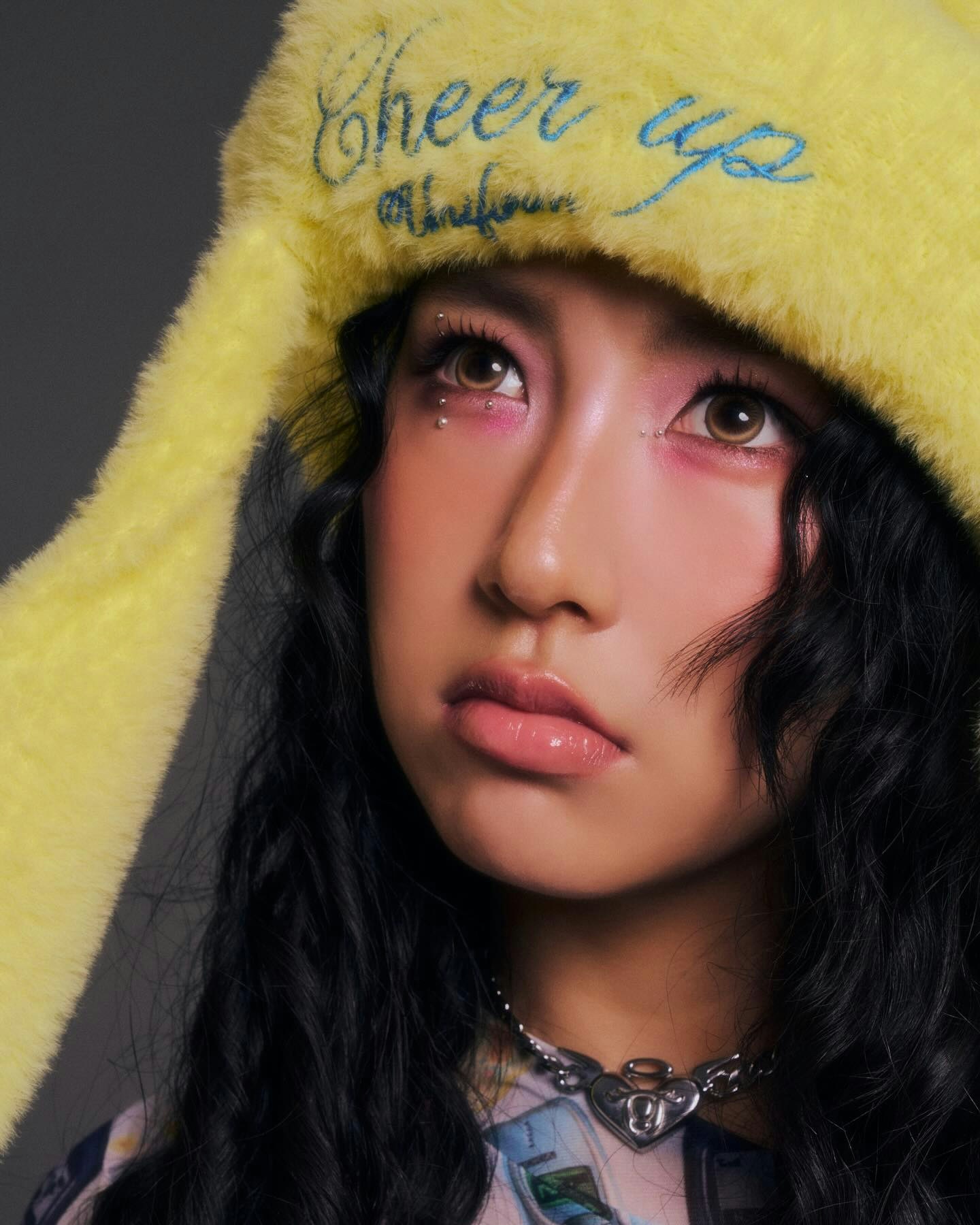 為了配合造型,她還戴了一頂巨型螢光黃色毛毛兔耳帽,配上眼角的粉色閃石妝容,充滿韓系女團味道。(IG@yiminghay)