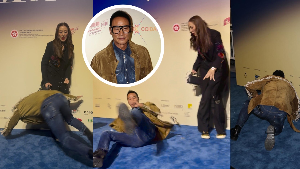任達華和太太琦琦、周汶錡、陳家樂晚上出席高訂時裝活動,任達華跟隨太太後方,行去Backdrop準備拍照時,不慎拌倒在地,他身手敏捷,打了個觔斗後立即企 ...