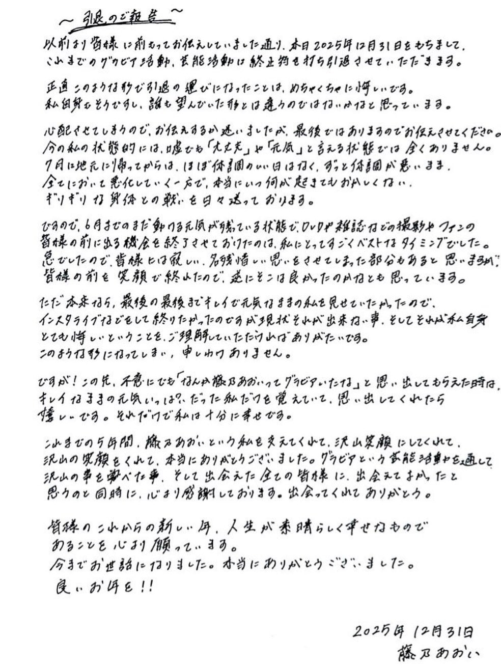 藤乃葵於2020年出道,她在寫真界擁有極高人氣,曾在日本雜誌年度評讀中奪得「百大巨乳女星」榜首。可是她於2023年證實患上惡性橫紋肌肉瘤,之後便停工接受治療,她於2024年一度復出,但健康狀態未能穩定改善。藤乃葵去年除夕宣布引退時,曾在信中提到她因為健康狀況不佳,無法再假裝自己一切安好,她自去年7月回到家鄉後,身體狀況每況愈下,並表示「隨時會發生什麼都不奇怪」。藤乃葵原本希望能開IG直播跟粉絲告別,可是她的身體狀況不允許,最終只能以書信形式道別。她當時在紙上寫上「最後了啊」、「真的非常喜歡你們」、「偶爾要想起我啊」,向粉絲留下最後的話。