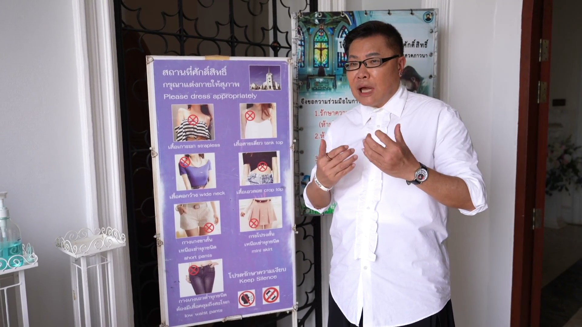 接住介紹考艾唯一一間天主教堂,採用歌德式設計,不過波波卻無緣入內參觀,Roger解釋說︰「呢間教堂同佛寺規定,有部份女士嘅服飾,唔太適合入去。」