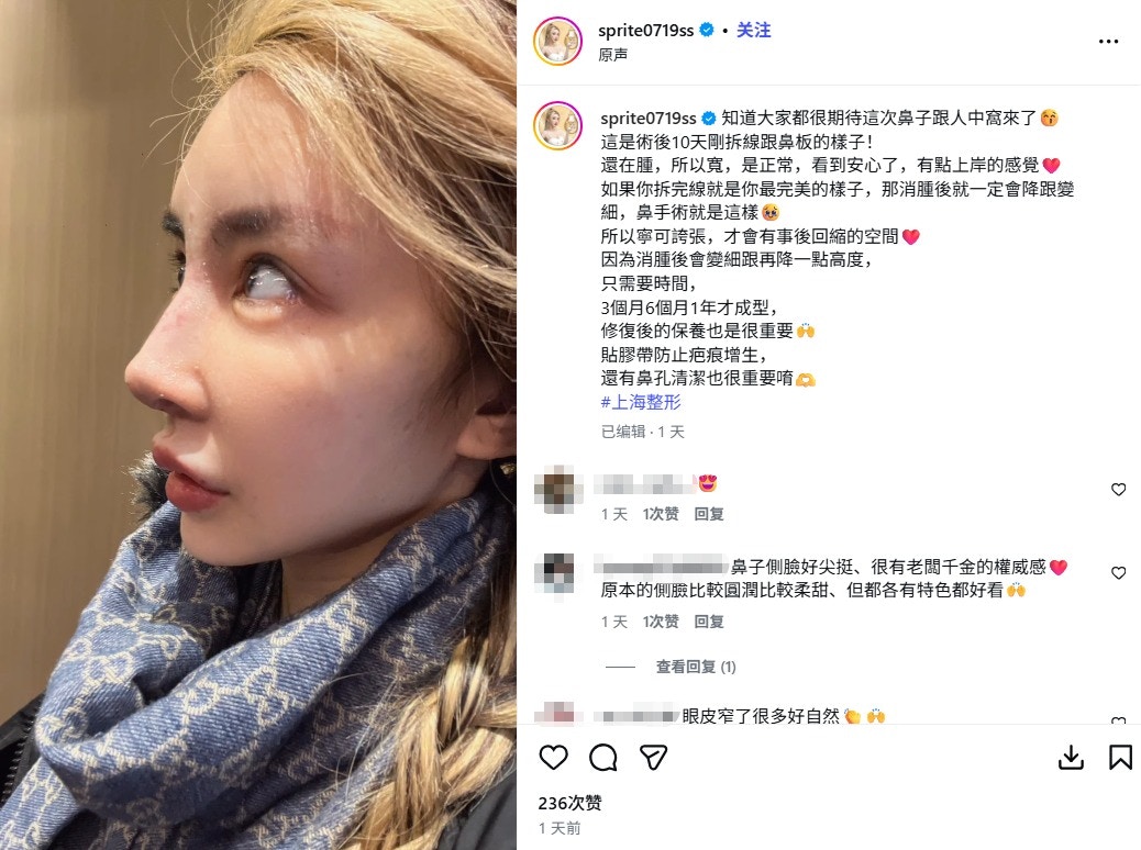 經過約10日的休養,剛拆線的雪碧便急著分享成果。雖然新鼻形仍處於腫脹期,但她已十分滿意:「這是術後10天剛拆線跟鼻板的樣子!還在腫,所以寬,是正常,看到安心了,有點上岸的感覺。」她更向有意整容的網民大派貼士,直言術後初期「寧可誇張」,因為消腫後鼻形會變細及降低高度,若拆線時已是完美樣子,消腫後反而會變得太小。她強調修復期漫長,需時3個月至1年才能完全定型,期間的傷口護理、貼膠帶防疤痕增生以及鼻孔清潔均至關重要。