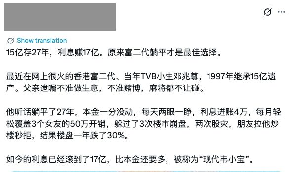近日瘋傳一篇有關的文章,指當年鄧兆尊取得15億後將錢存進銀行,27年後靠利息賺進17億,躺平不投資不買股就實現賺取超過本金,直言是最成功「富二代」、「現代韋小寶」,更被不少網民盛讚是新馬師曾當年教導兒子做「二世祖」是正確的。但其實文章錯漏百出,現實是,2006年官司才結束,即最多只有20年時間。