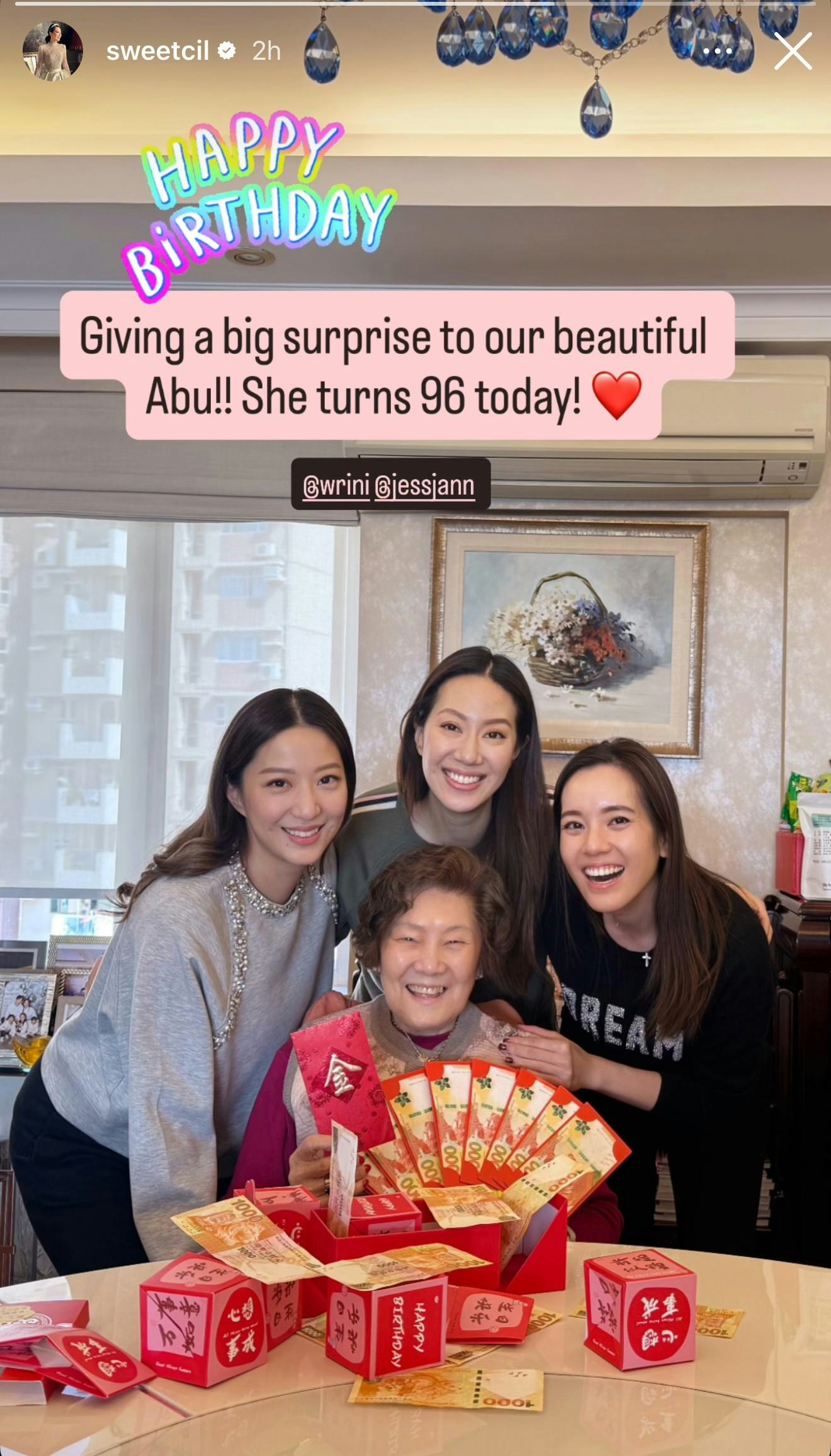 汪詩詩在限時動態上載與汪圓圓、表妹湛琪清為外婆慶生的照片。四人身處家中,未見有隆重布置,但勝在低調又溫馨。汪詩詩、汪圓圓、和模特兒表妹湛琪清(Jessica)齊聚為外婆慶生,照片中不見甄子丹身影。96歲的外婆笑意盈盈,三個孫女均嫁了富貴好人家,出嫁後仍回來慶老人家生日,難怪外婆精神狀態極佳。