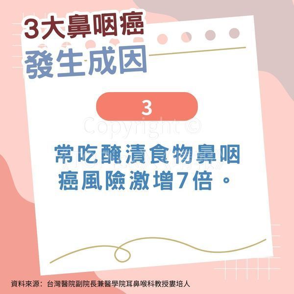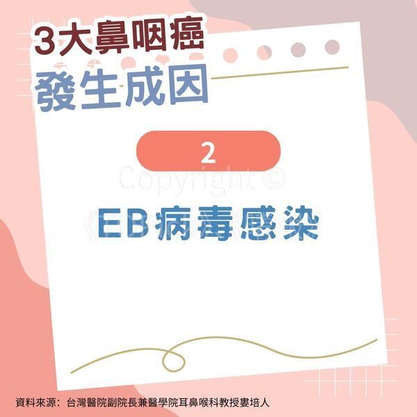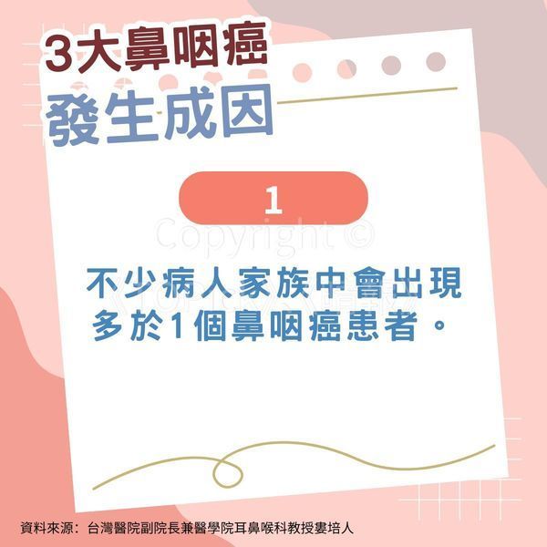 台灣醫院副院長兼醫學院耳鼻喉科教授婁培人日前於當地健康節目《健康2.0》分享指,鼻咽癌發生成日主要與以下3點相關,惟病情極為致命,一經轉移存活期最短僅6個月,不容忽視: