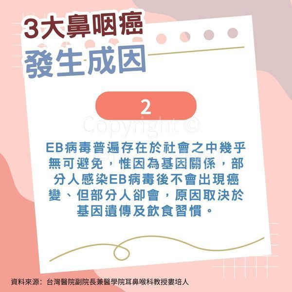 • 鼻咽癌與基因、EB病毒、醃漬食物三成因相關