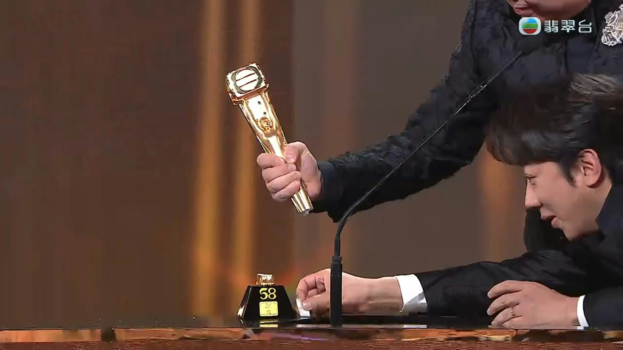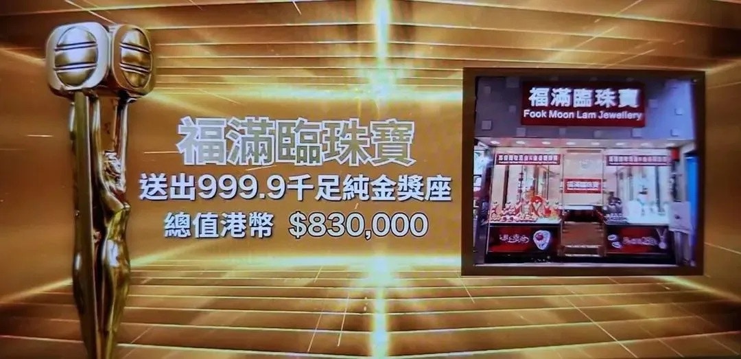 TVB的廣告中,提到由「福滿臨珠寶」贊助的999.9千足純金獎座,總值$83萬港幣,有人質疑為何獎座這麼「流」,竟然一扑就爛。(電視截圖)萬