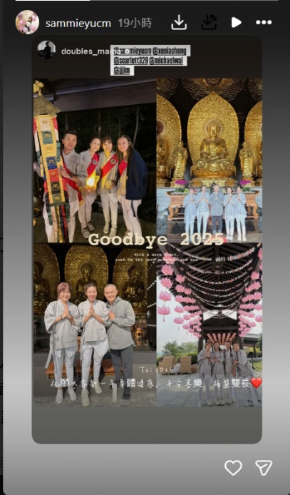 鄭文在IG分享慈山寺元日萬燈法會的片段,余思敏等人當日中午已在寺內參與義工活動,身穿灰白色制服,全程素顏示人。久未露面的余思敏似乎已有一段時間未有修剪頭髮,頭頂驚現2吋白髮,而兩鬢的白髮亦相當明顯,令容顏看上去頗為憔悴,失去昔日光彩。 在晚會開始期間,眾人盤膝席地而地,鄭文突然拉余思敏入鏡頭,一直用手機拍攝的余思敏先是驚訝,但亦相當配合擠出笑容,與一班老友度過一個愉快一天。余思敏隨後亦轉載影片,並寫上「GOODBYE 2025」,暗示想告別充滿波折的一年。