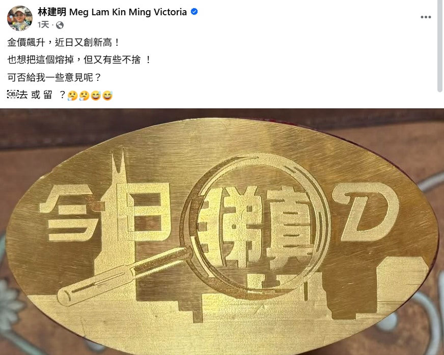 大姐明分享的照片中,金牌刻有當年亞視皇牌節目《今日睇真D》的標誌,形狀為橢圓形,雖然未有標明實際大小,但目測相當厚實重秤。面對不斷攀升的金價,大姐明留言問網民意見:「金價飆升,近日又創新高!也想把這個熔掉,但又有些不捨!可否給我一些意見呢?去或留?」