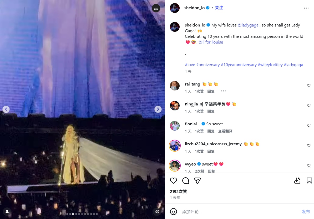 適逢相戀10周年紀念,羅孝勇亦為老婆送上超級驚喜。他在社交網以英文深情告白:「My wife loves @ladygaga , so she shall get Lady Gaga! 🙌Celebrating 10 years with the most amazing person in the world ❤️🤓」原來他特意安排帶王丹妮欣賞偶像Lady Gaga的演唱會。