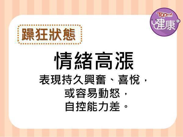 根據醫管局資料,患者會出現躁狂和抑鬱兩種情緒,主要病徵如下: