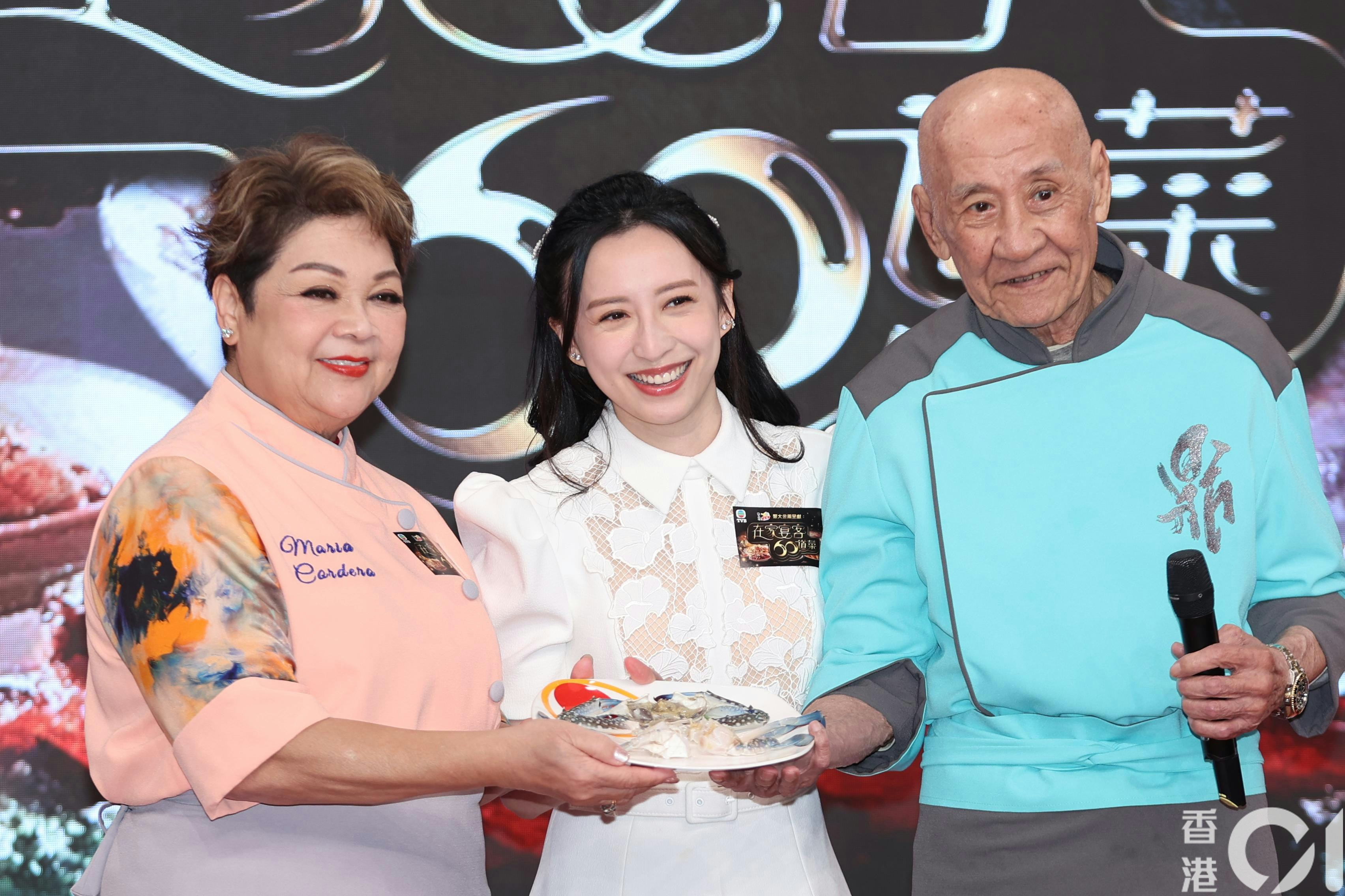 龔嘉欣聯同肥媽(Maria Cordero)及李家鼎,於電視城出席煮食節目《在家宴客60道菜》宣傳造勢活動。(陳順禎攝)
