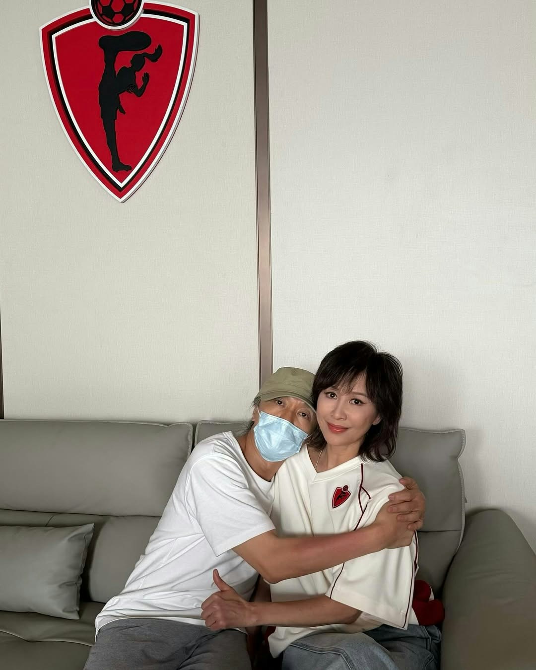 劉嘉玲在與周星馳的合照中,穿上印有少林女足徽章的白色球衣,讓《少林女足》波衫疑似曝光!(劉嘉玲IG圖片)