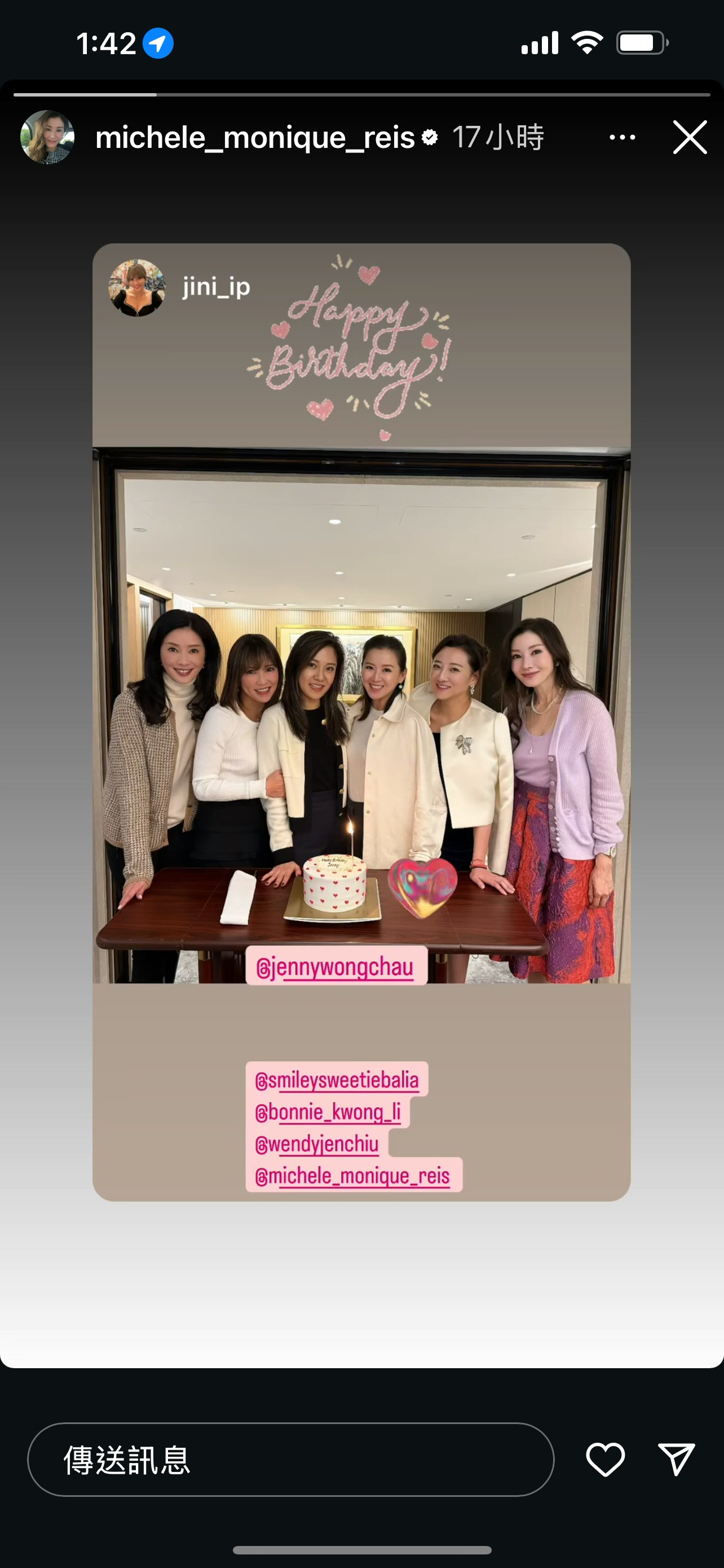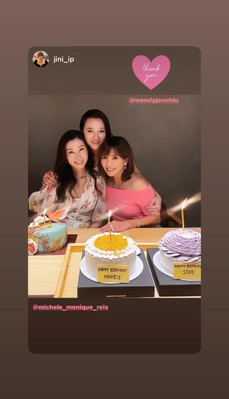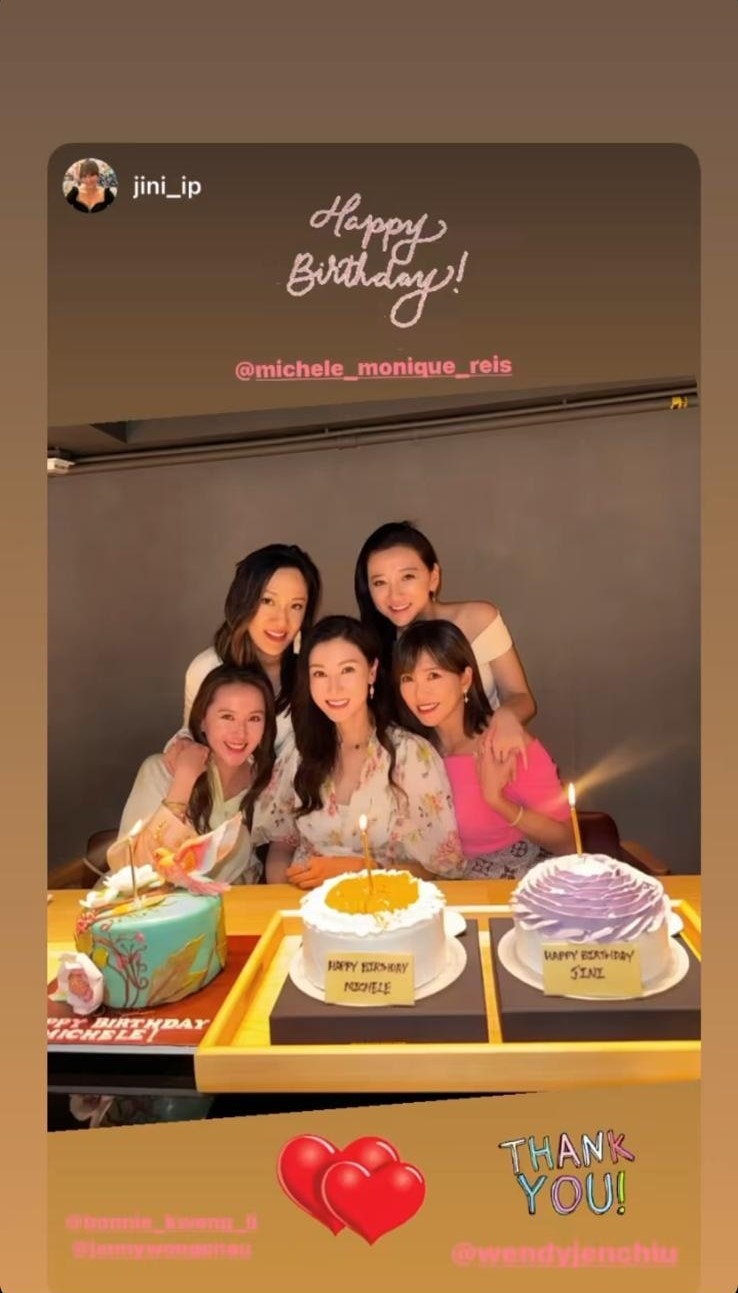 黎姿獲名媛好友慶祝生日,多年好友李嘉欣(Michele)亦有現身。(IG截圖)