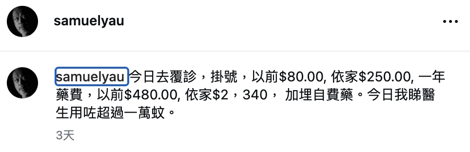 邱萬城指今日睇醫生使成萬蚊。(IG@samuelyau)