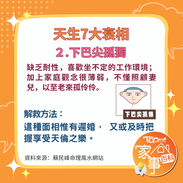 - 解救方法:這種面相惟有遲婚,又或及時把握享受天倫之樂。