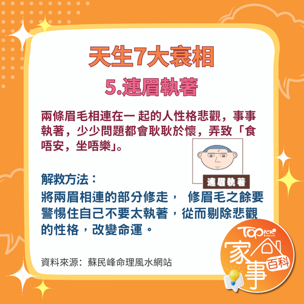 - 解救方法:修整齊條眉,兼不斷提醒自己要腳踏實地做人。