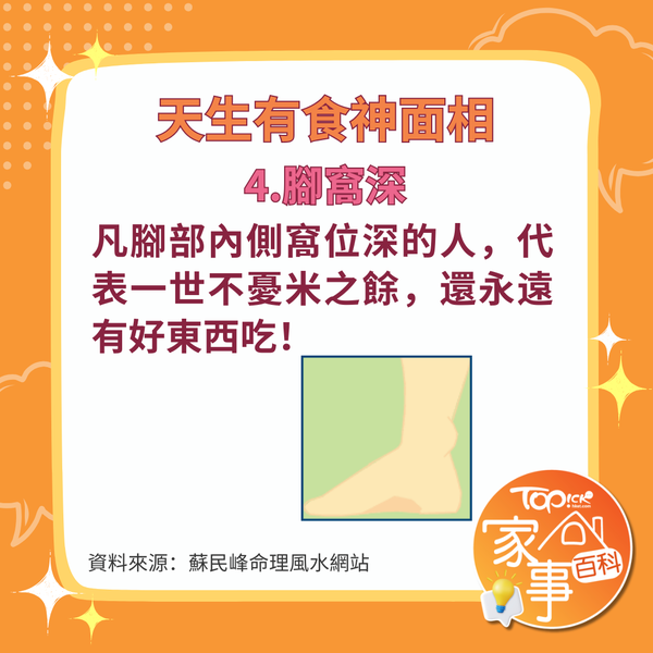 凡腳部內側窩位深的人,代表一世不憂米之餘,還永遠有好東西吃!