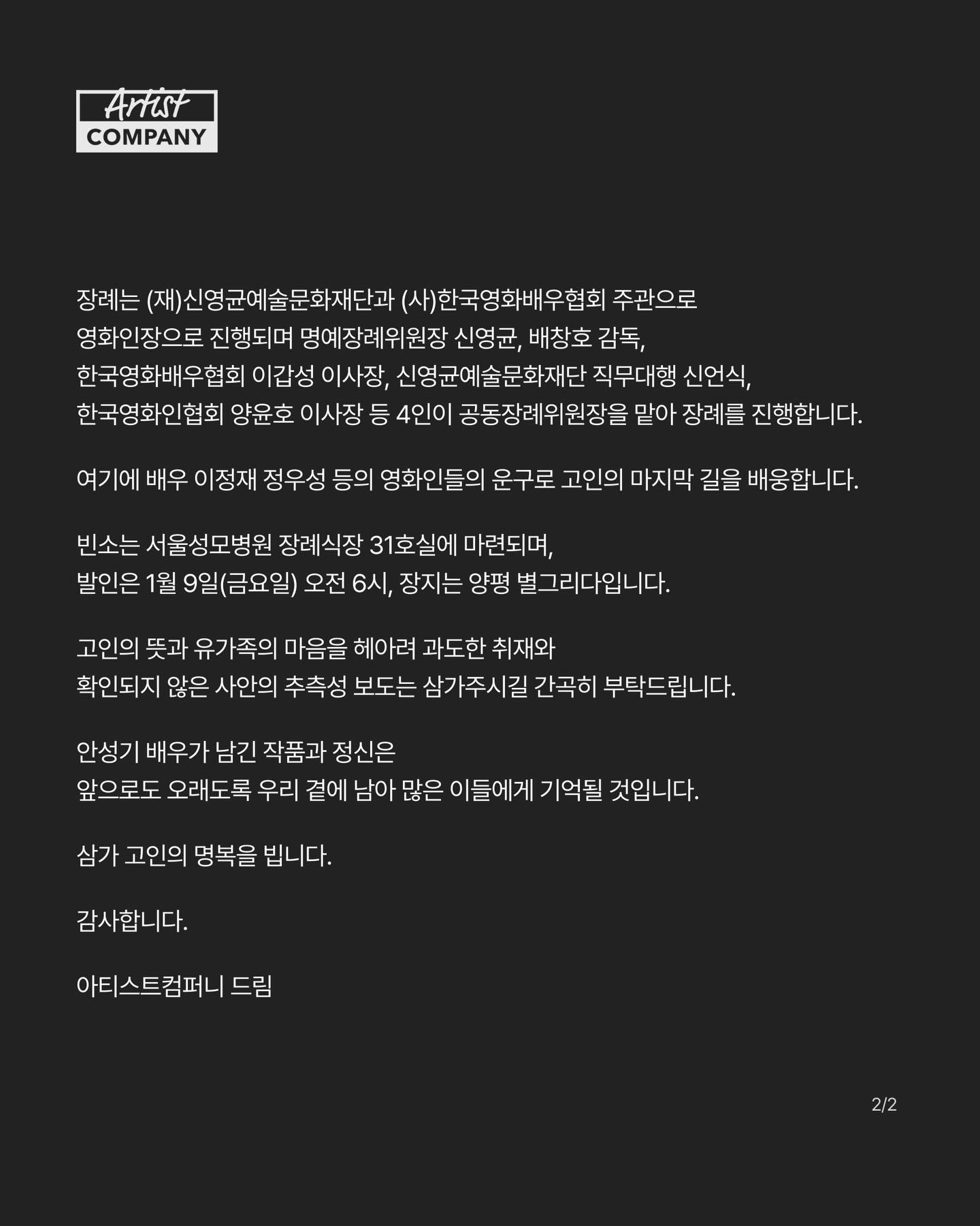 安聖基所屬的經理人公司Artist Company隨即發布訃告證實消息。據悉,安聖基自2019年起便確診患上白血病(血癌),多年來一直頑強地與病魔抗爭。然而病情在2025年年底急轉直下,他於12月31日突發心臟驟停,被緊急送醫搶救。雖然接受了一連串急救與治療,但最終仍未能出現奇蹟,安聖基身體無法恢復,延至1月5日撒手人寰。