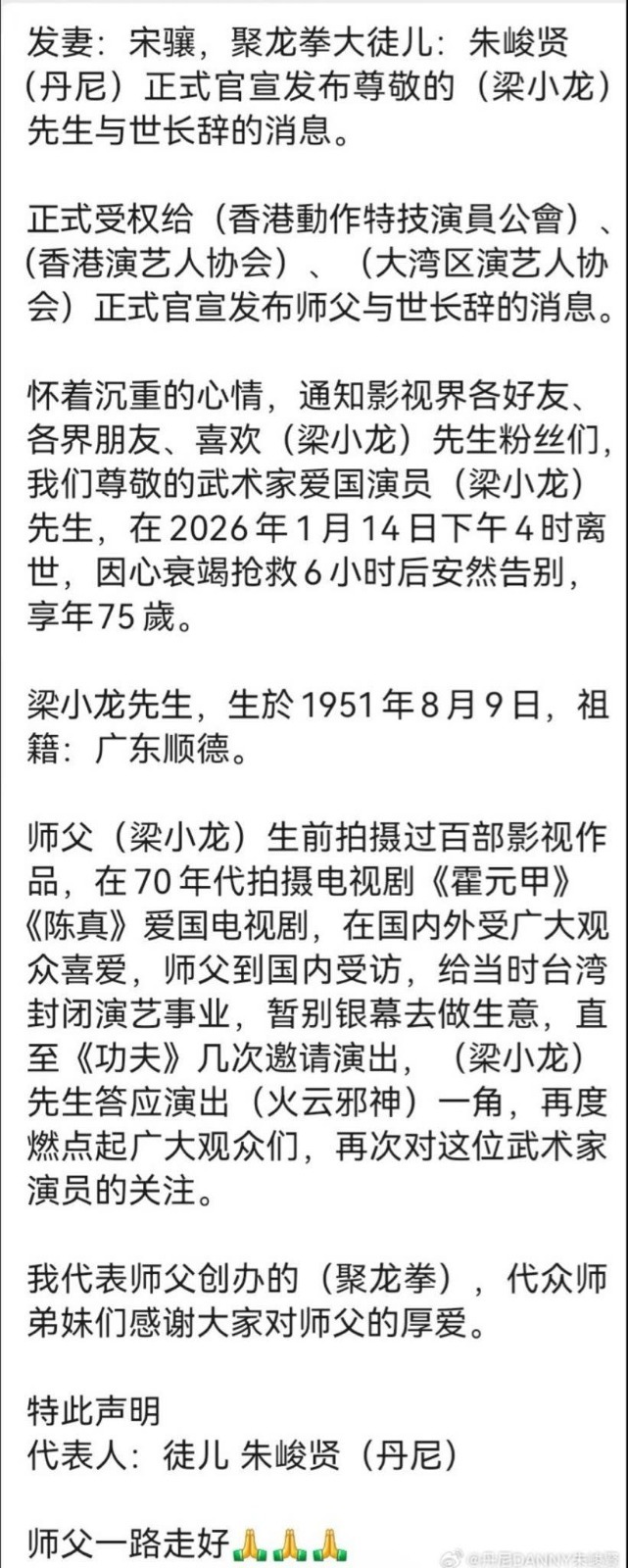 梁小龍徒兒朱峻賢今日(19日)發文代梁小龍遺孀正式發布梁小龍死訊,聲明如下: