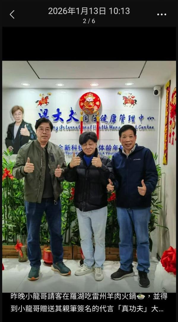 著名武打巨星梁小龍於1月14日逝世,享年77歲。據梁小龍抖音平台帖文,離世前一晚梁小龍仍在深圳羅湖與一眾友人打邊爐。從合照可以看到當晚梁小龍身穿黑色羽絨外套、淺色牛仔褲,脖子上圍著一條寶藍色圍巾(或高領毛衣)。雖然面容略顯消瘦,但他精神狀態看起來相當不錯。席間,梁小龍不僅豪氣請客,還即興發揮,將一幅親筆簽名的「真功夫」字畫贈送給友人作為留念。面對鏡頭時,他露出了一貫的招牌笑容,更豎起大拇指,顯得開朗而親切。在場所有人都未曾察覺任何異樣。