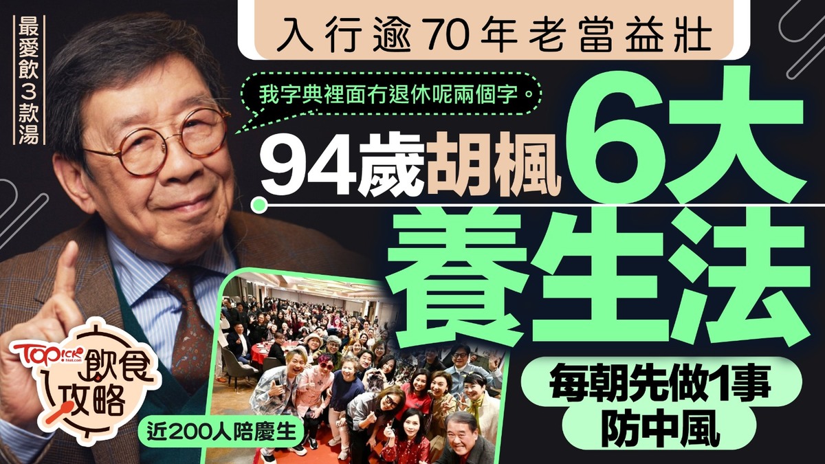 修哥/胡楓/養生/健康|94歲胡楓(修哥)近日獲近200位圈中好友慶生,包括劉德華、譚詠麟、黃日華等巨星,場面溫馨熱鬧。四代同堂的他精神飽滿、思路清晰,成為影壇公認的「常青樹」。修哥多年來樂於分享其養生哲學,總結其長壽秘訣,並非依賴名貴補品,還原基本步並持之以恆地悟出養生6招。
