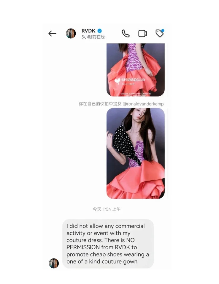 可是,有網民將有關直播的片段傳給Ronald van der Kemp後,對此他就相當介意,回覆說:「 I did not allow any commercial activity or event with my couture dress. There is NO PERMISSION from RVDK to promote cheap shoes wearing a one of a kind couture gown.(我沒有允許任何人使用我的高級訂造服進行任何商業活動。RVDK完全沒有給予任何許可,允許有人穿著這件獨一無二的訂造服來推廣廉價鞋)。」