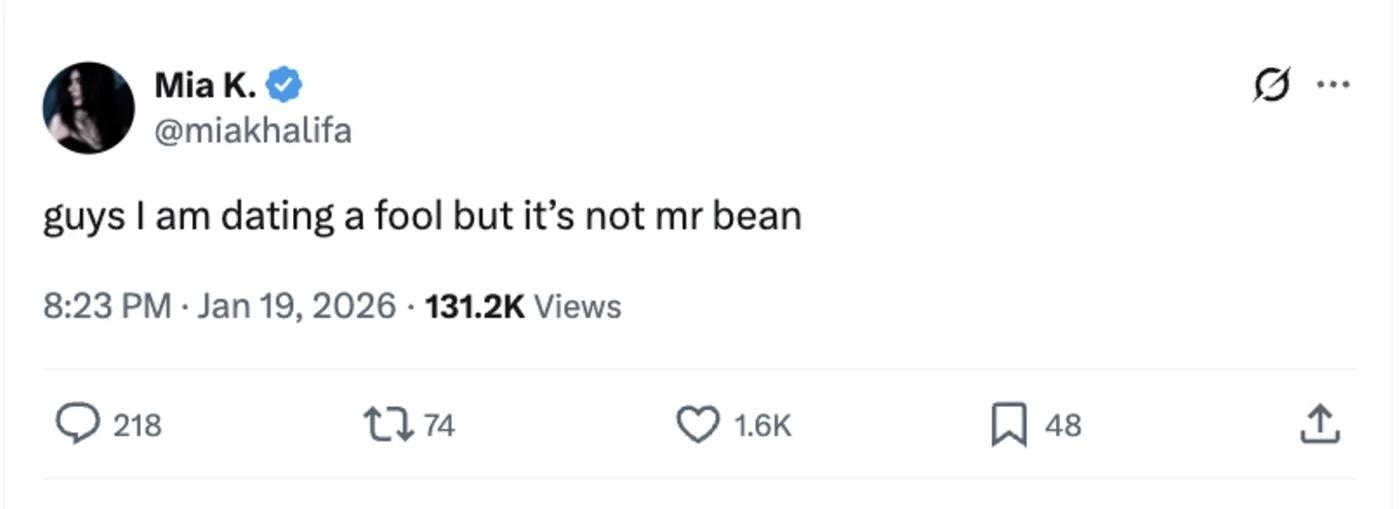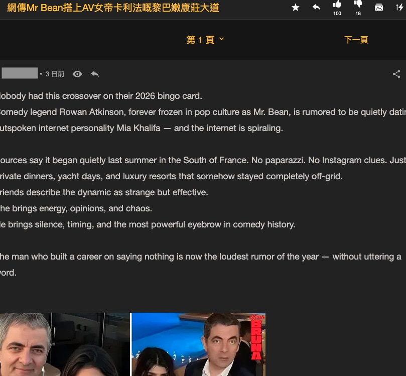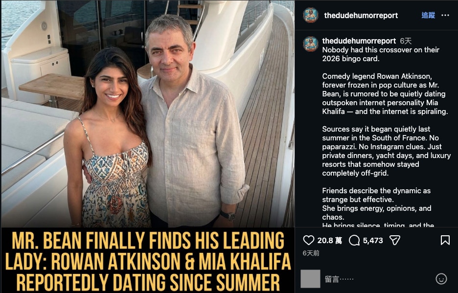 隨後,一些網民和網站更不嫌事大,用AI生成了多張戇豆先生和Mia Khalifa在遊艇和海灘上玩樂的合成照片,實在令人哭笑不得。而Mia Khalifa本人也在其X帳號中,一語雙關地公開澄清與戇豆先生沒有關係:「guys I am dating a fool but it's not mr bean(大家,我正與一個傻瓜約會,但並不是戇豆先生)。」