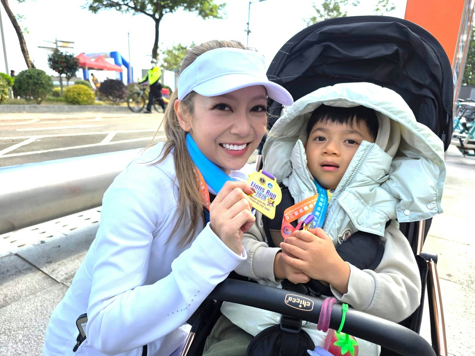 何雁詩推著坐在BB車的兒子,以母子檔輕鬆完成賽事,兩人更開心展示完成賽事後獲得的獎牌。何雁詩開心能和囝囝一起落場,她說:「原本Fred(丈夫鄭俊弘)想帶小朋友一齊參與,但佢因爲今天要做舞台劇未能出現,始終星期日想同小朋友出街玩,唔想兩公婆都忙,最後都係決定帶Asher出嚟。Asher今日玩得開心,佢對聲音好敏感,起步及返回場地時聽到好大聲音會有啲驚,但剛才望住吐露港跑時不停笑,尤其見到有啲跑手穿著吹氣馬仔衫更加開心。」