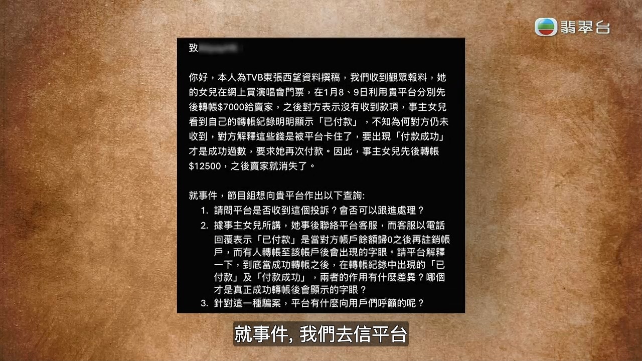 朱文慧小背心出鏡。(《東張西望》截圖)事主表示,女兒在平台購買演唱會門券,初次過數成功後,騙徒籍口收不到錢又叫女兒多次入數,終損失了$12,500 。《東張西望》去信平台,平台指有關用戶已取消了戶口,所以顯示是 「已付款」 而不是「付款成功」。事主表示,報《東張》原意是覺得騙徒手法較新,希望沒人會再受騙。 朱文慧報道騙案。(《東張西望》截圖) 朱文慧報道騙案。(《東張西望》截圖) 騙徒手法層出不窮。(《東張西望》截圖) 騙徒手法層出不窮。(《東張西望》截圖)