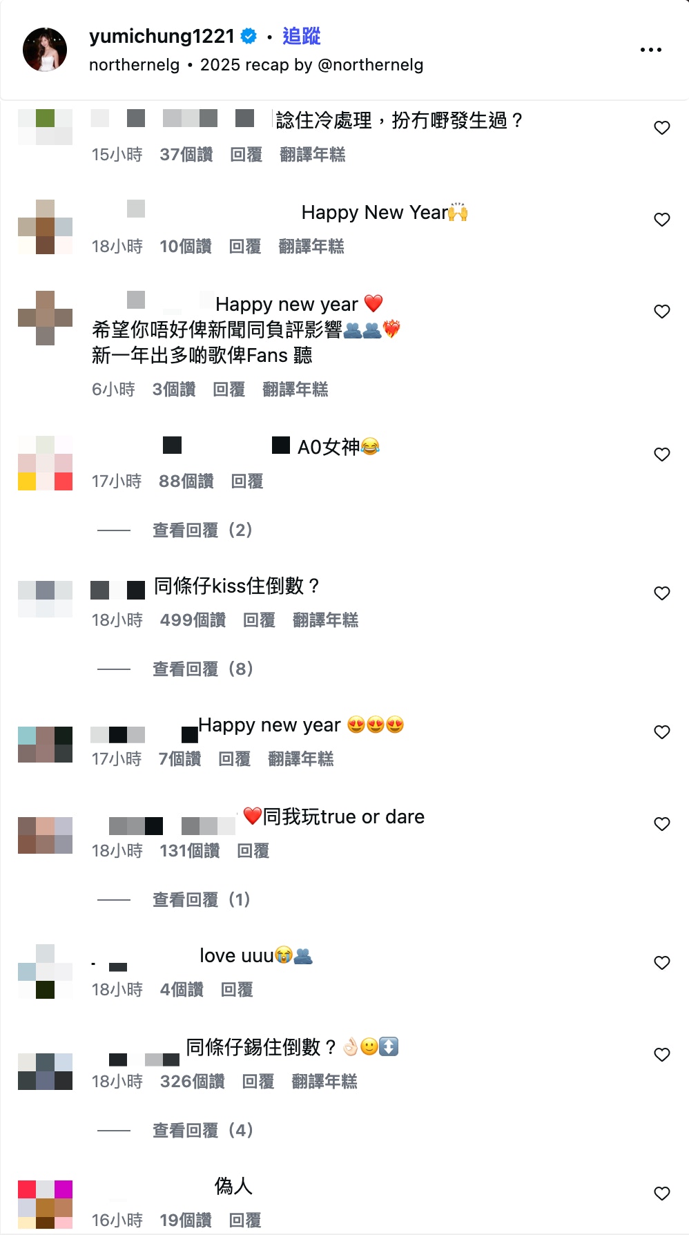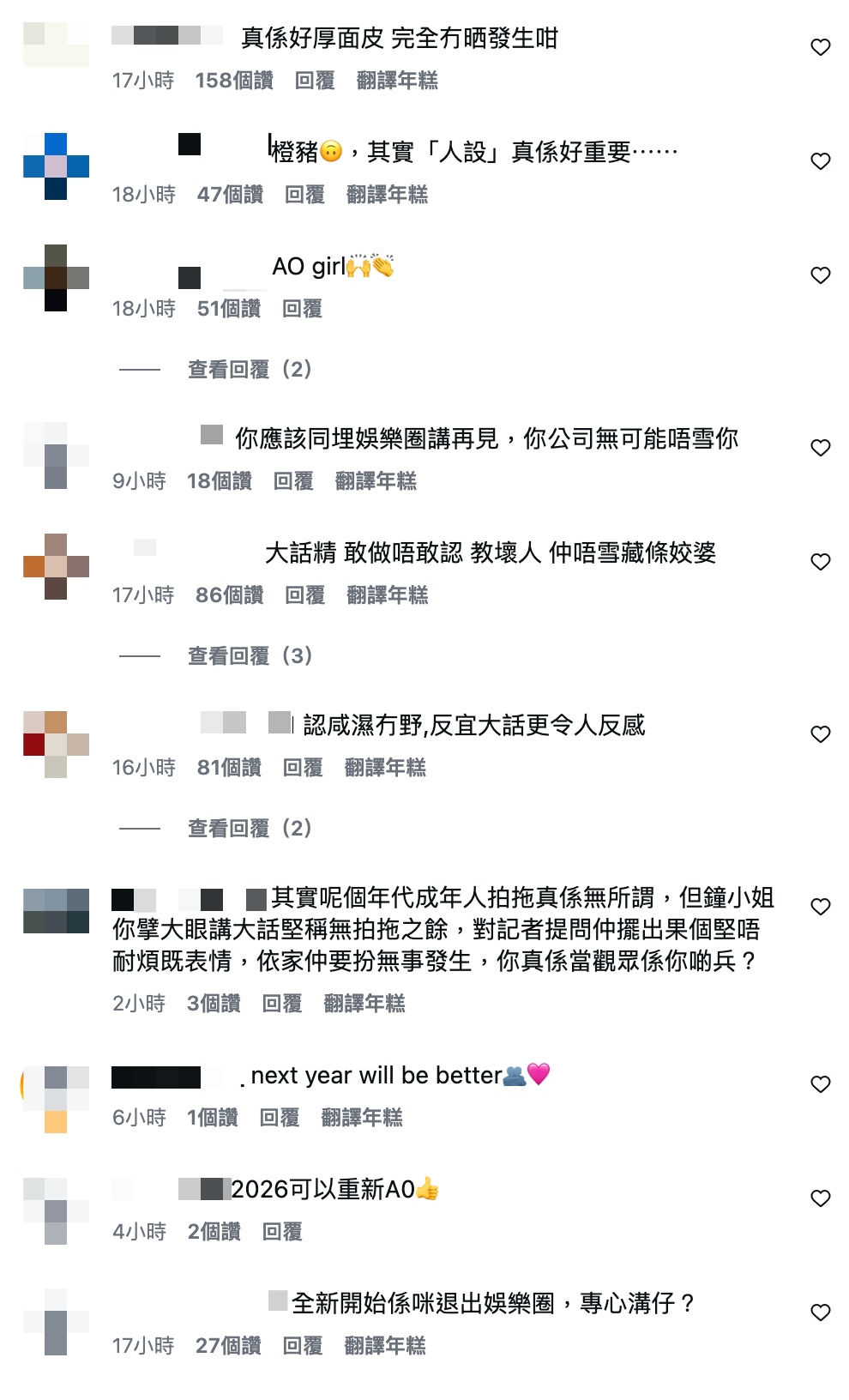 有不少人批評鍾柔美冷處理、大話精、厚面皮,叫她退出娛樂圈。(IG@yumichung1221) 鍾柔美拍片冧Fans 表示將繼續努力做好自己 而鍾柔美亦有在與粉絲的TG群組跟粉絲「米粉」們講新年快樂,她自拍了一條片,樣子精神、面露笑容,似乎心情大靚,她說:「祝大家新年快樂啊🩷」、「多謝米粉一直嘅支持 我會繼續努力做好自己🥹🙏🏻🥰」不過網民得知後,就繼續鬧她厚面皮、無恥等等,更呼籲TVB應雪藏她。