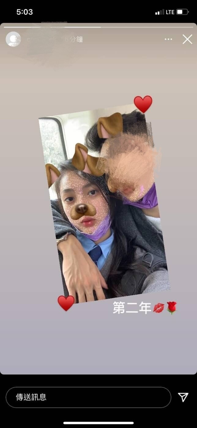 爆料人提供了鍾柔美與中學時其中一任男友Royson的合照,見女方手執飲品,輕靠男方肩膀,兩人露出甜蜜微笑。(讀者提供)