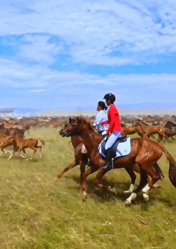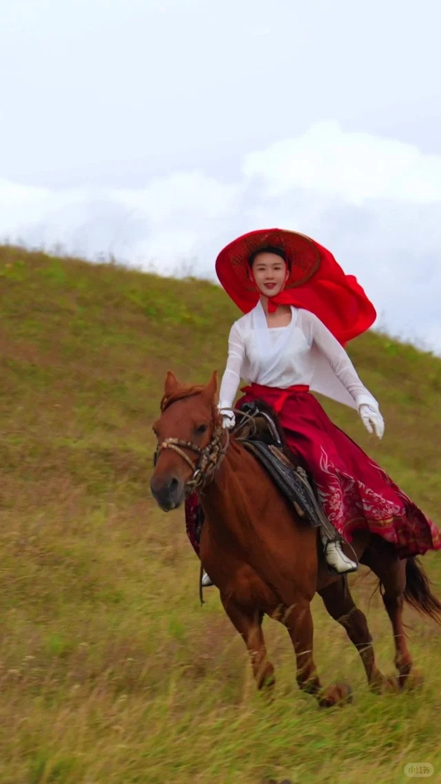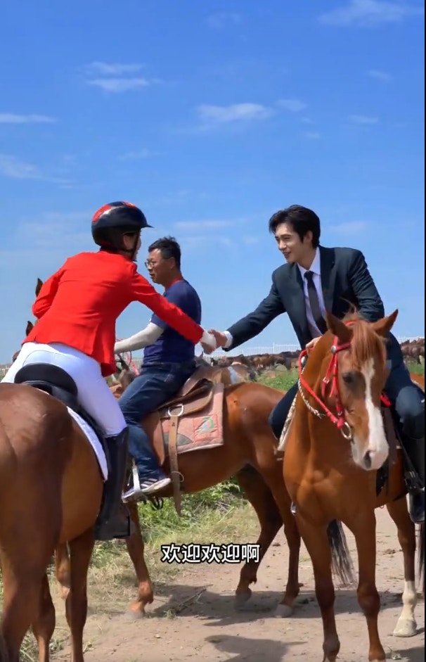 賀嬌龍在演藝圈最廣為人知的畫面,莫過於2025年新疆昭蘇天馬文化旅遊節。當時她與影壇巨星吳京、人氣男神于適及竇驍共同拍攝「萬馬奔騰」宣傳視頻。片中賀嬌龍身披標誌性紅衣在陣中颯爽馳騁,氣場絲毫不輸一眾男星,該片段更被譽為「天馬節標誌性傳播素材」,成功將新疆文旅推向國際。