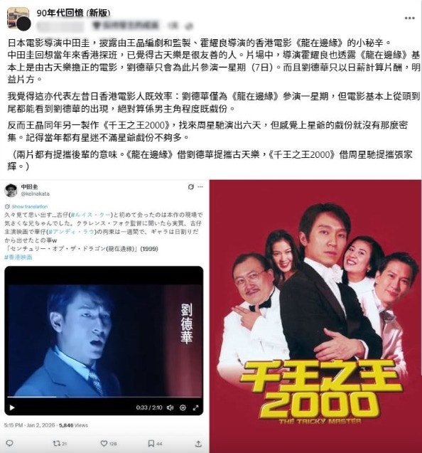 中田圭在文中分享,他時隔許久再次重溫由王晶編劇及監製、霍耀良執導的經典港產片《龍在邊緣》,勾起了不少回憶:「讓我想起,我第一次見到古天樂就是在這部電影的片場,他當時是個很友善的人。」中田圭更爆料指,導演霍耀良曾告訴他一個秘密:「劉德華當時只需要在古天樂主演的電影裏出演一周,而且是按比例支付片酬,所以他才能付得起古天樂的片酬。」